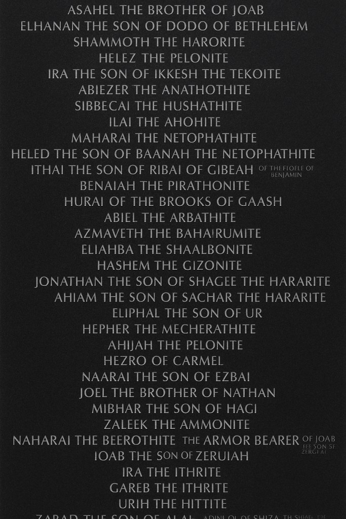 After the famous few, the Scriptures list dozens of names—mighty men whose specific acts are lost to history. Warriors like Elhanan, Sibbechai, Jonathan, and many others. Some are mentioned only once. Their battles, scars, and sacrifices are unknown to us—but not to God.
